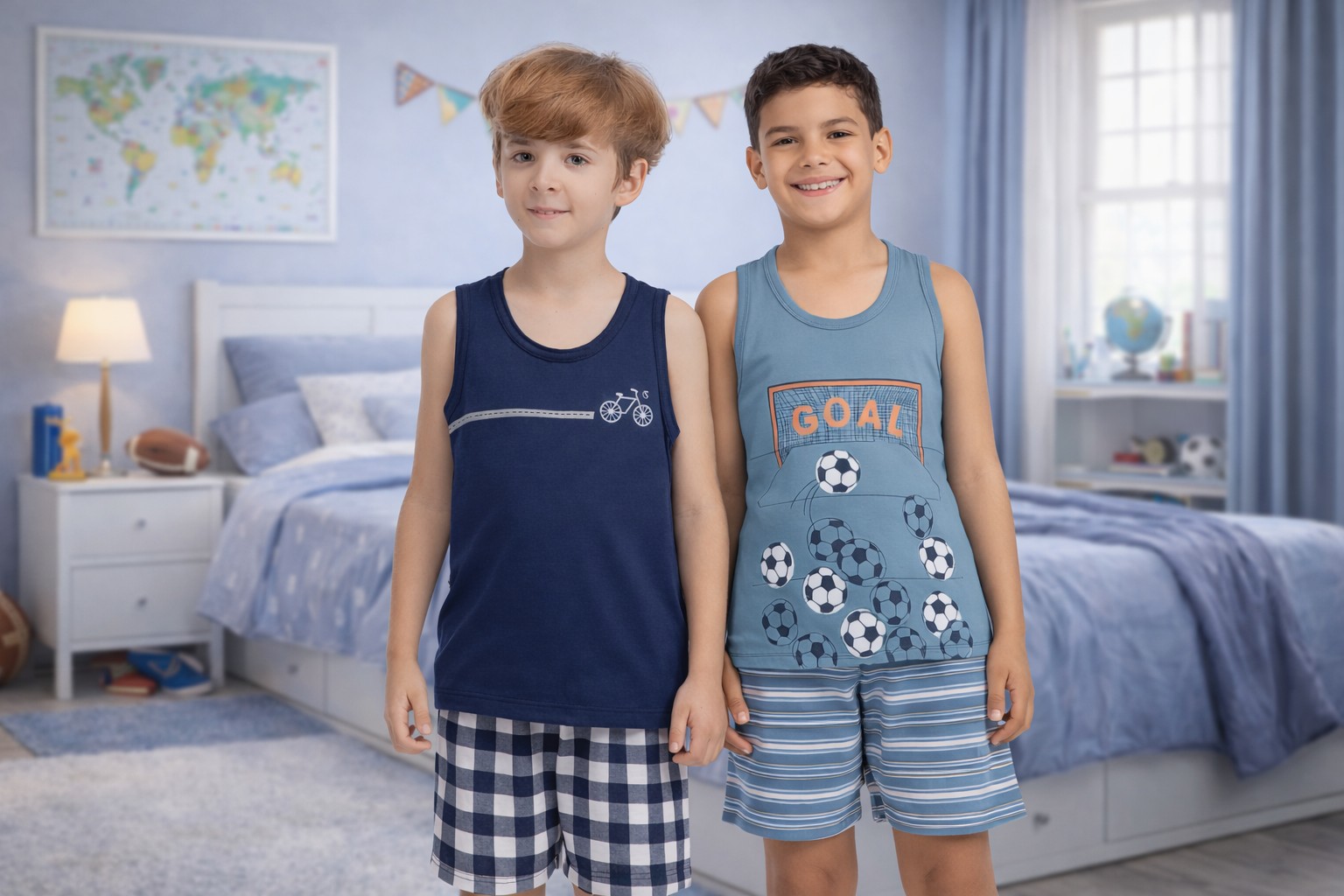 O primeiro conjunto apresenta regata azul mescla com estampa temática futebol “GOAL” e short listrado, criando um visual divertido e esportivo que estimula imaginação e personalidade.