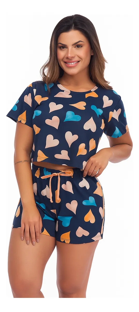 Nosso conjunto pijama feminino cropped + short com estampa de corações coloridos foi projetado para mulheres que valorizam descanso com charme, liberdade e frescor. O cropped dá um toque moderno, enquanto o short e a estampa de corações coloridos adiciona aquele toque divertido e delicado.
