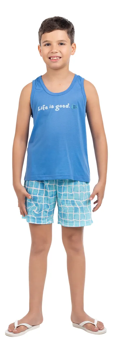 Combinação regata + short: veste com facilidade, ótima para meninos que se movimentam antes de dormir ou descansam após brincar.