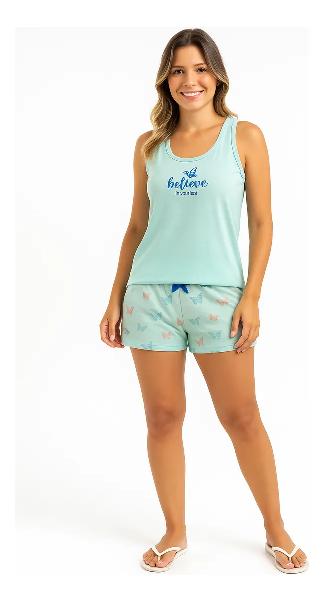 Regata verde com estampa “Believe” com combinação do short com borboletas: visual delicado, feminino e cheio de significado.