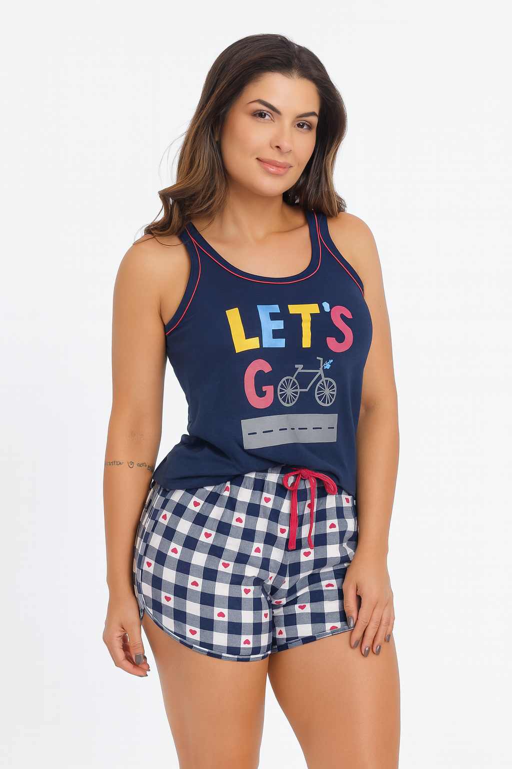 - O conjunto é composto por regata e short, com visual moderno e acabamento delicado.